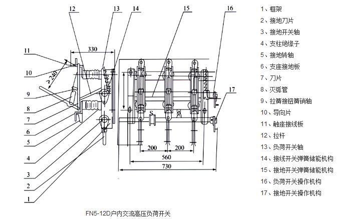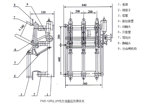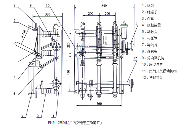 FN5-12R(L)型户内交流高压负荷开关-熔断器组合电器亦称带脱装置负荷开关(以下简称开关),适用于50Hz,额定电压6-12KV的网络中,可开断负荷电流、过载电流及短路电流,本负荷开关配用CS6-Ⅰ型手动操作机构,本产品专用的CS□手动机构。